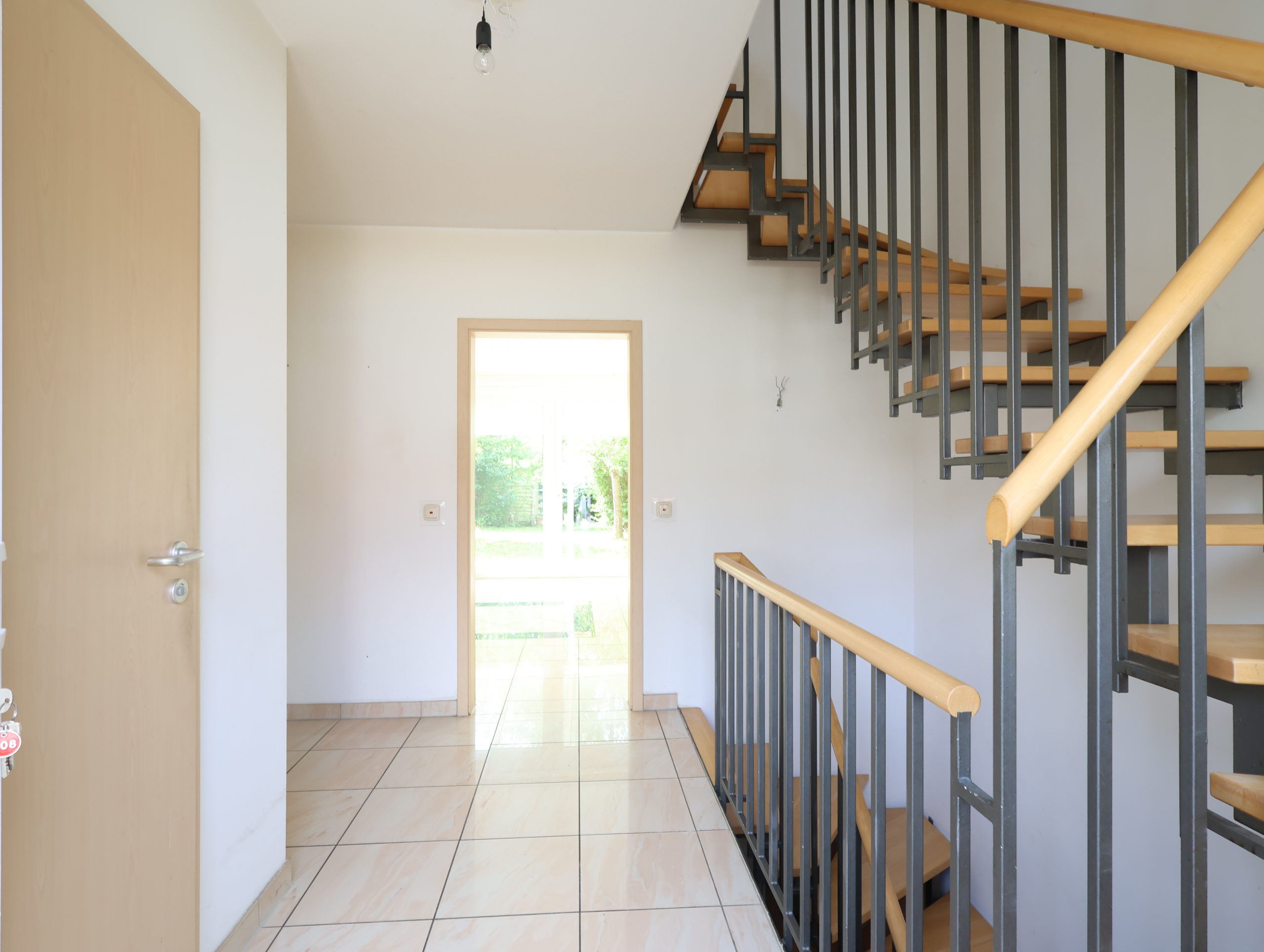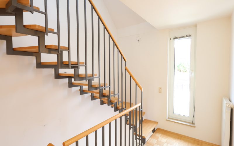 Über eine elegante Massivholztreppe gelangt man in die oberen Etagen: